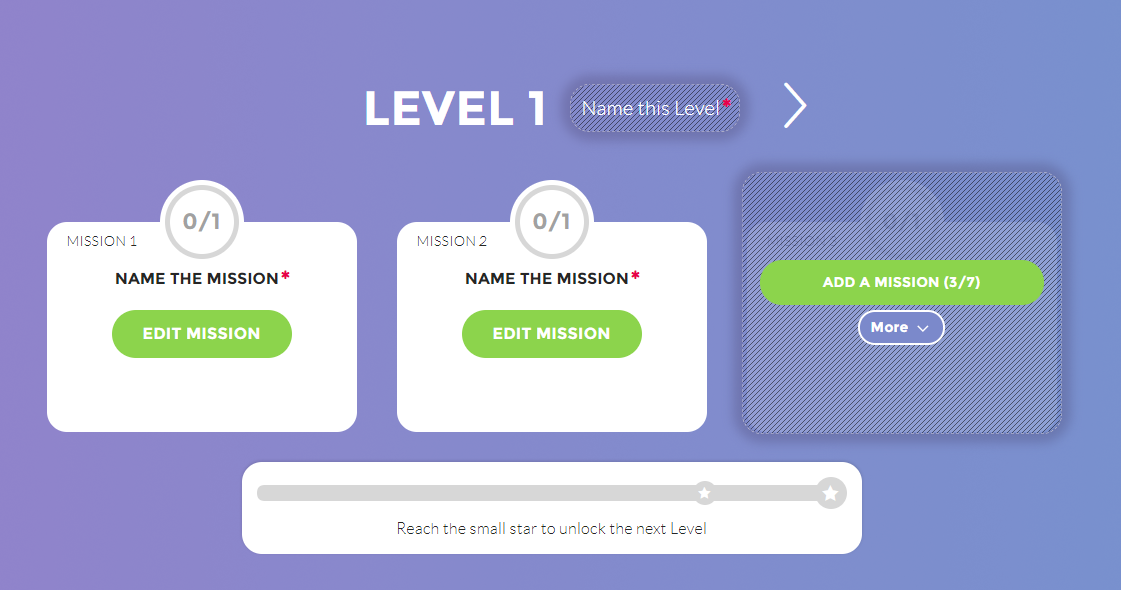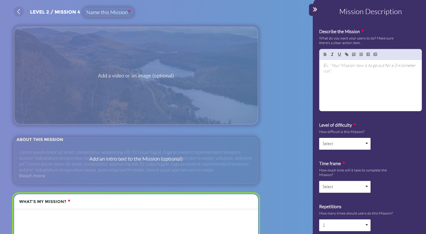 Mission name, Level of difficulty, Time frame, and "What's my Mission?"