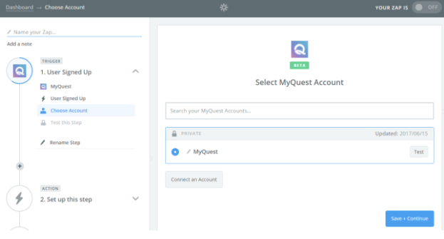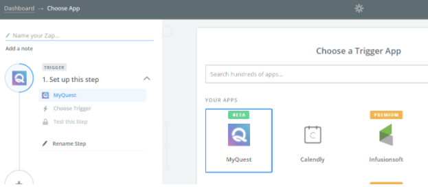 On the next step, choose any Zapier application you would like to integrate with myQuest (such as InfusionSoft), and act upon the data from the first myQuest step.