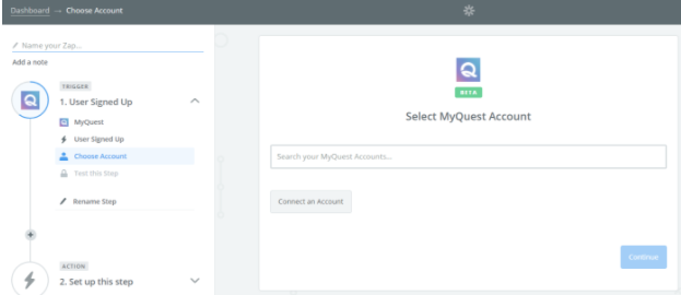 To integrate any third-party system with myQuest through Zapier, you have to set up a Zapier account. Then, we will send you an invitation link.