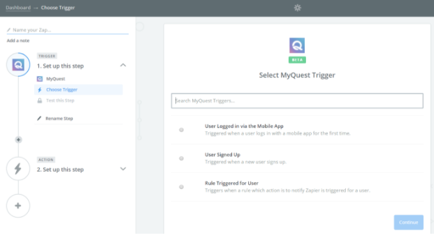 Next, choose the desired trigger you want to use. Information about the triggers which the myQuest Zapier app supports can be found here.