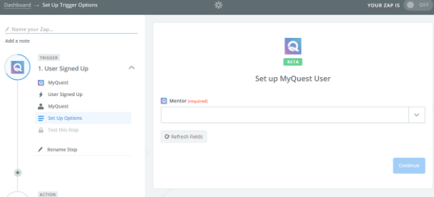 To set up a Zapier trigger for new sign up & new mobile sign up, choose the email address of the Quest mentor for which you’d like to set up this specific Zap.