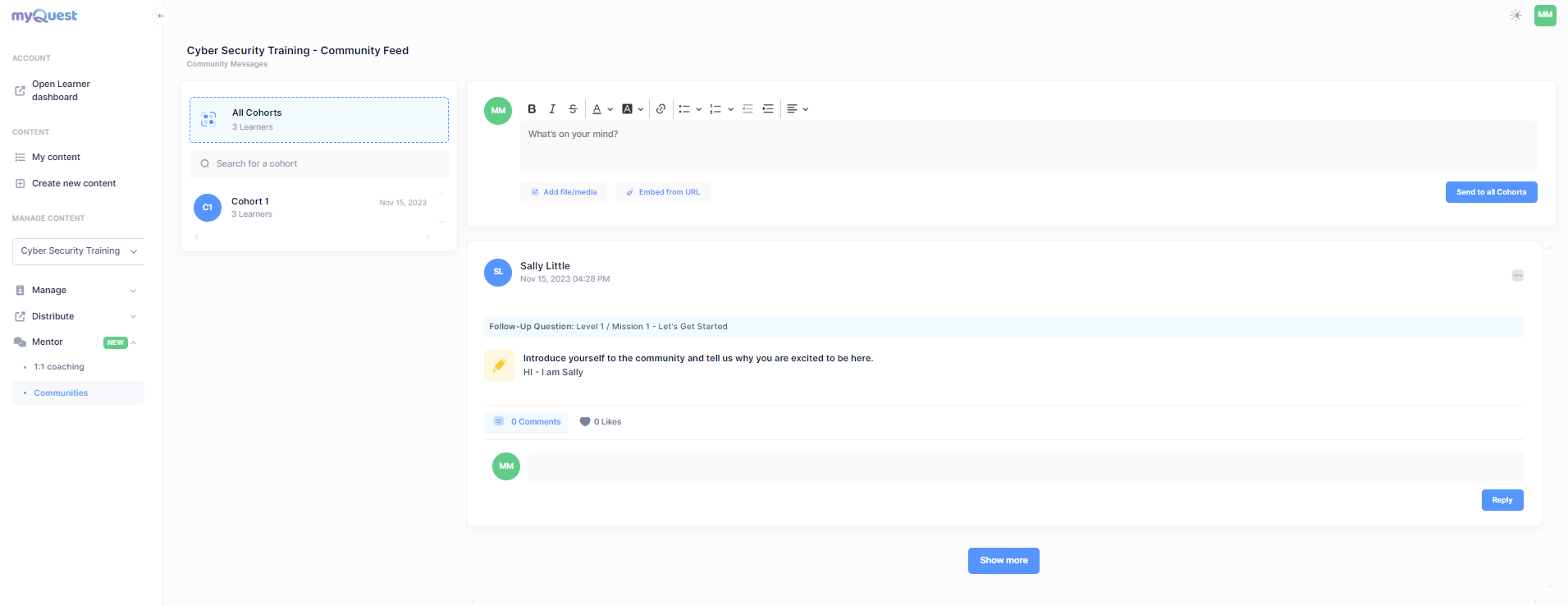 If you select 'Communities', you will see a list of the various cohorts you're mentoring. You'll have the ability to post messages in each of these communities.
