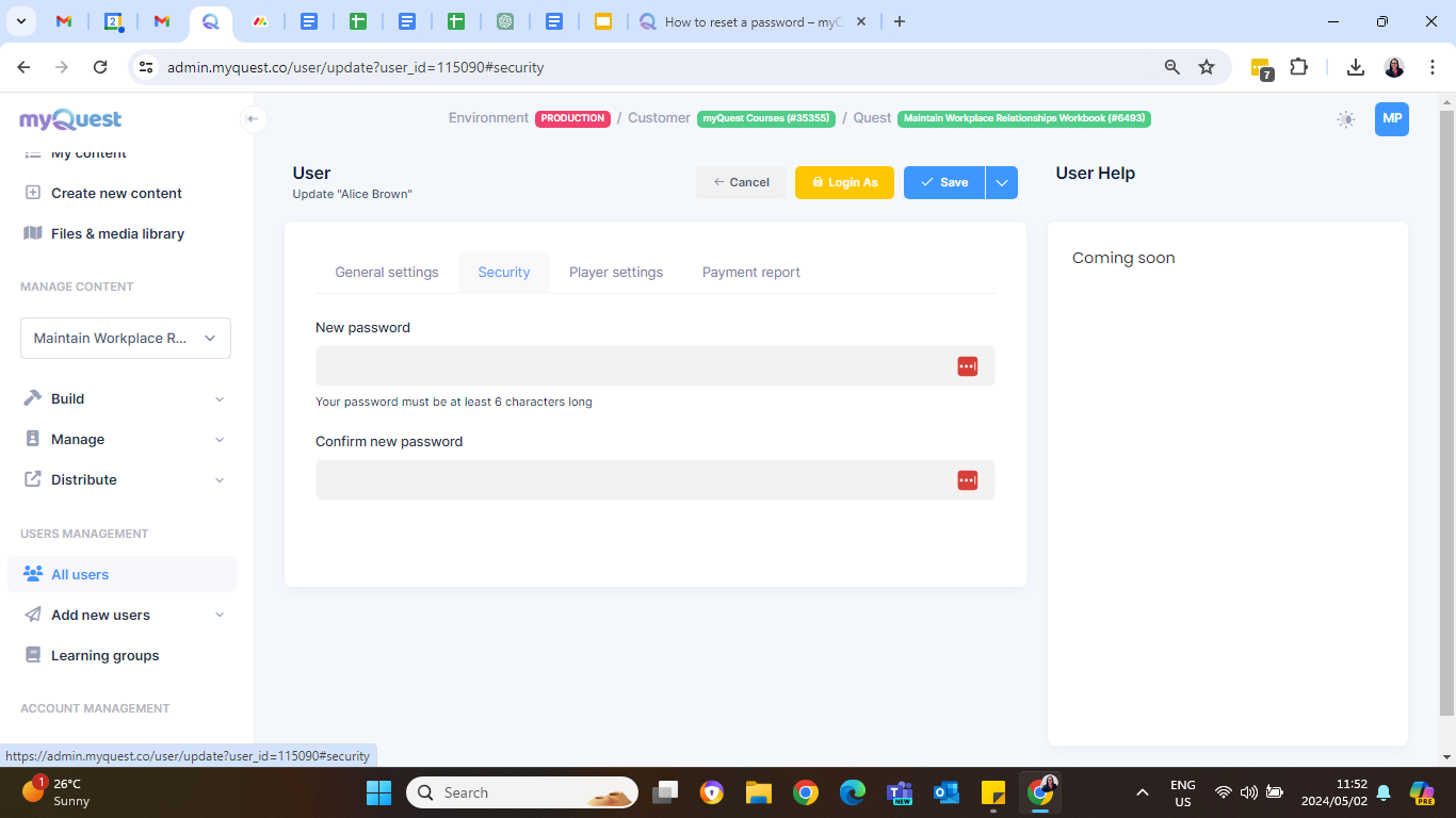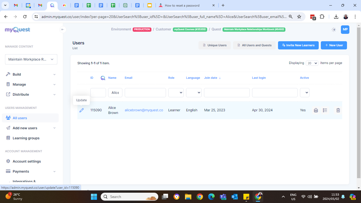 On the user login pop up screen > there will be a password reset button > the user can press this to receive an email to reset their own password.